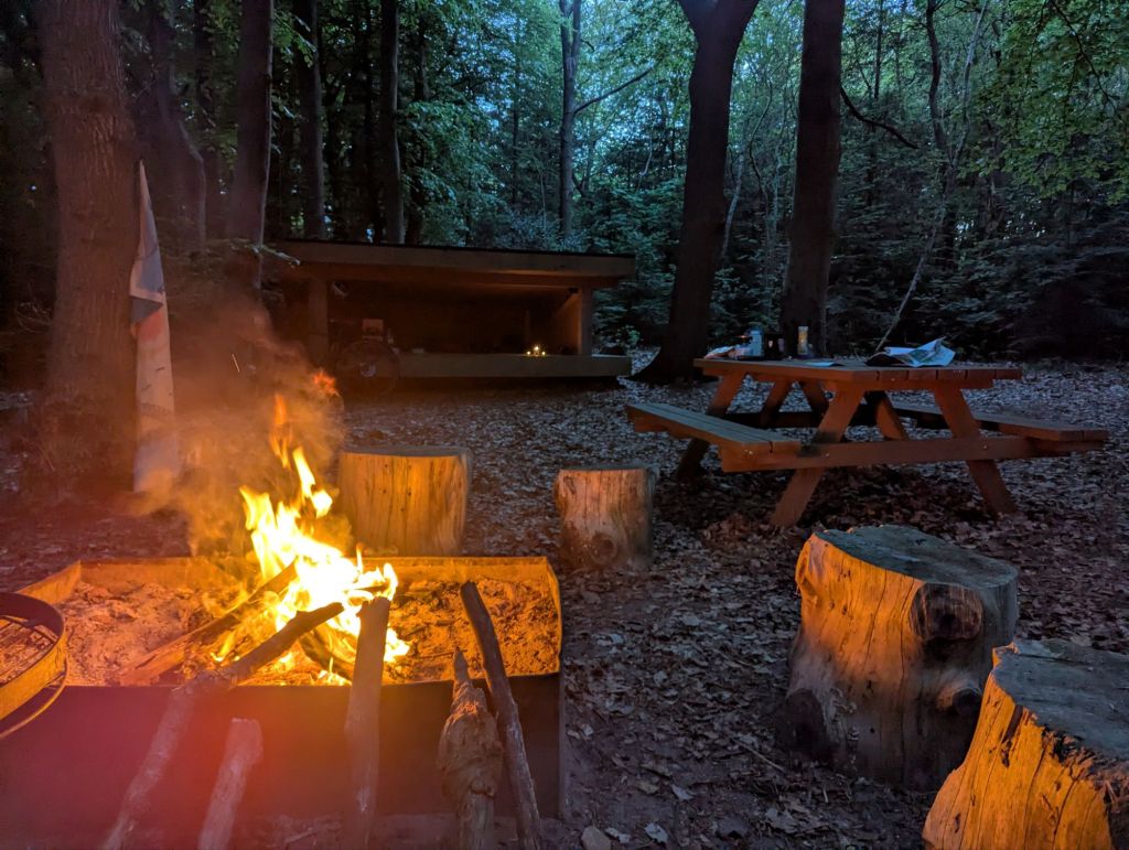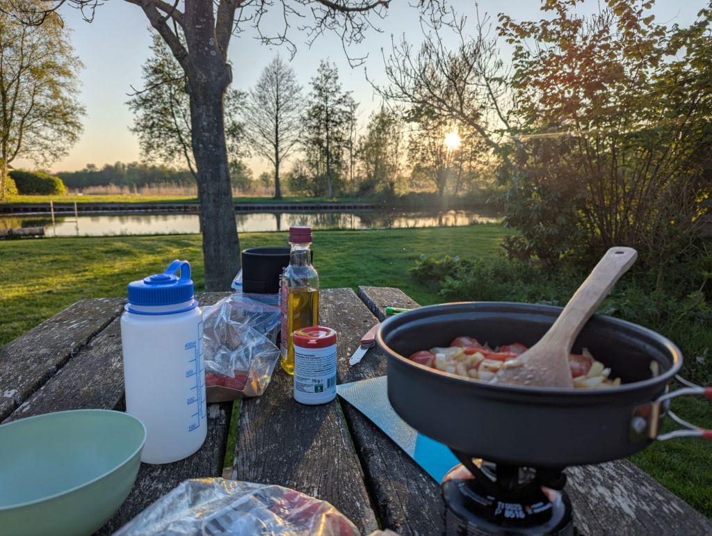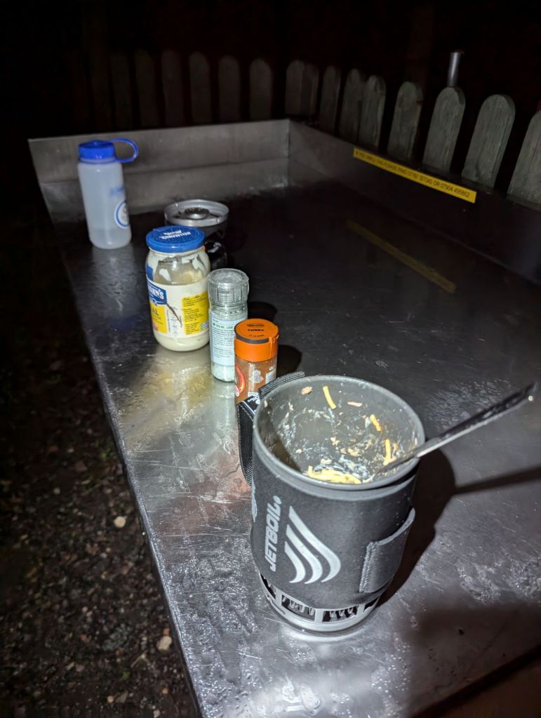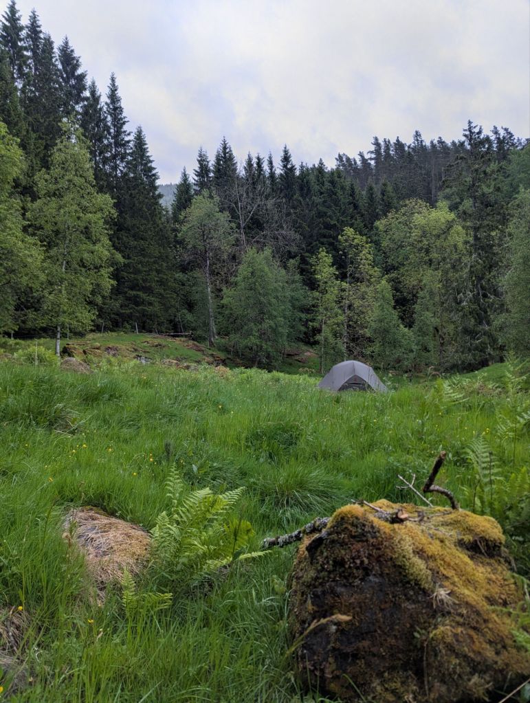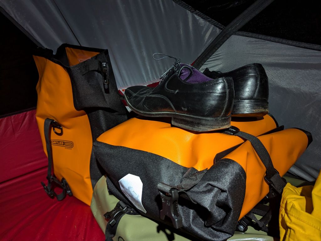 I knew it would be a pain to try and do everything with the bike loaded up, so I did another foot scouting mission and found a candidate flat spot before shifting everything across. It was tiring but in perfect conditions, and from what I could make out of my surroundings in the evening twilight I knew it would be worth it.