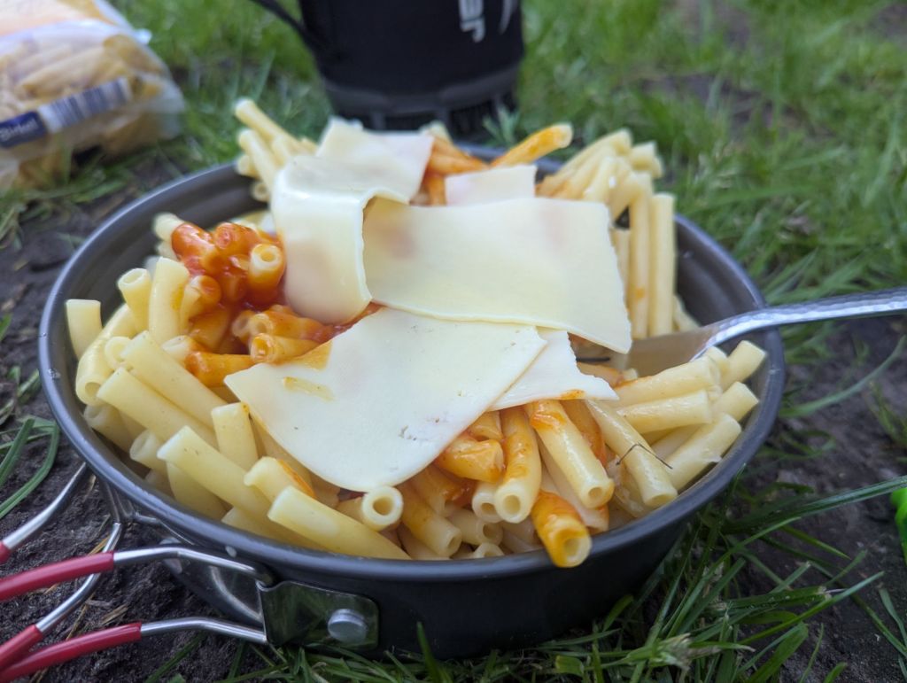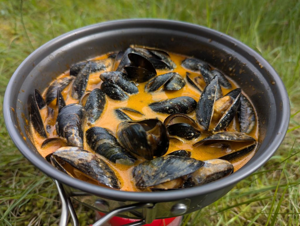 After thawing out in my thermals and feeling human again, I got rid of the floating dead mussels, gave the rest a rinse and cooked them up with red pesto for breakfast.