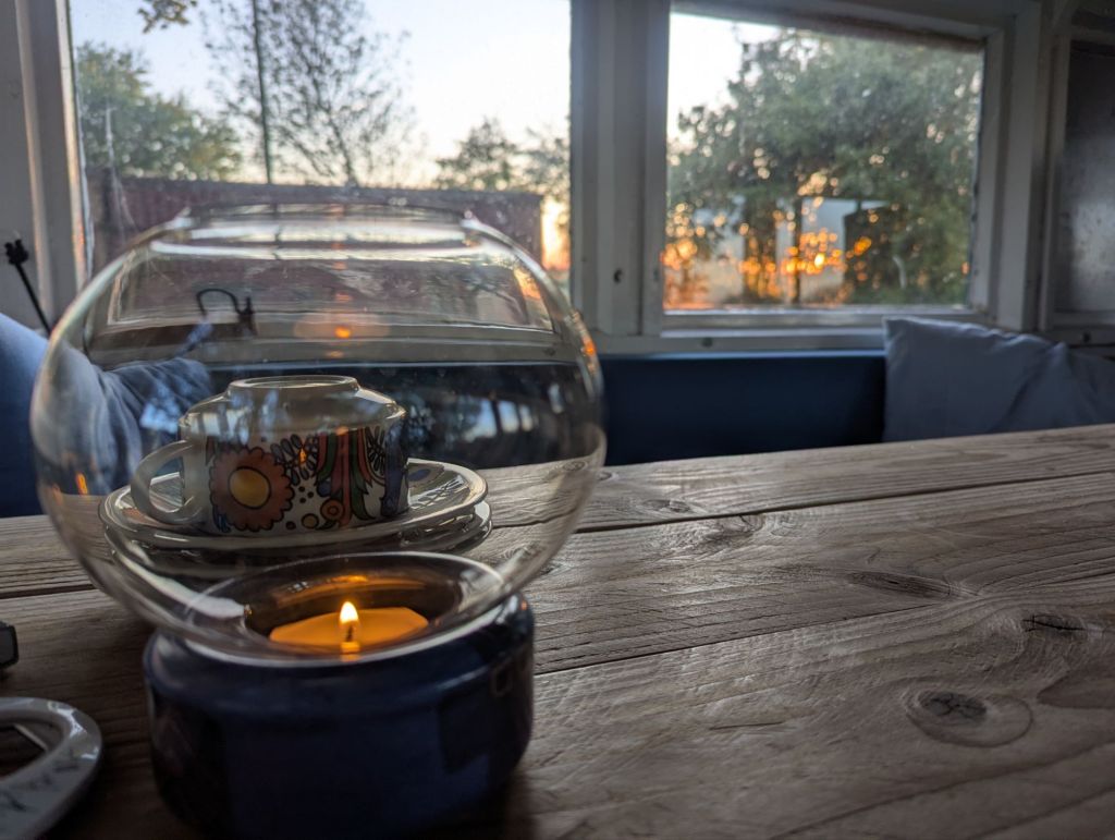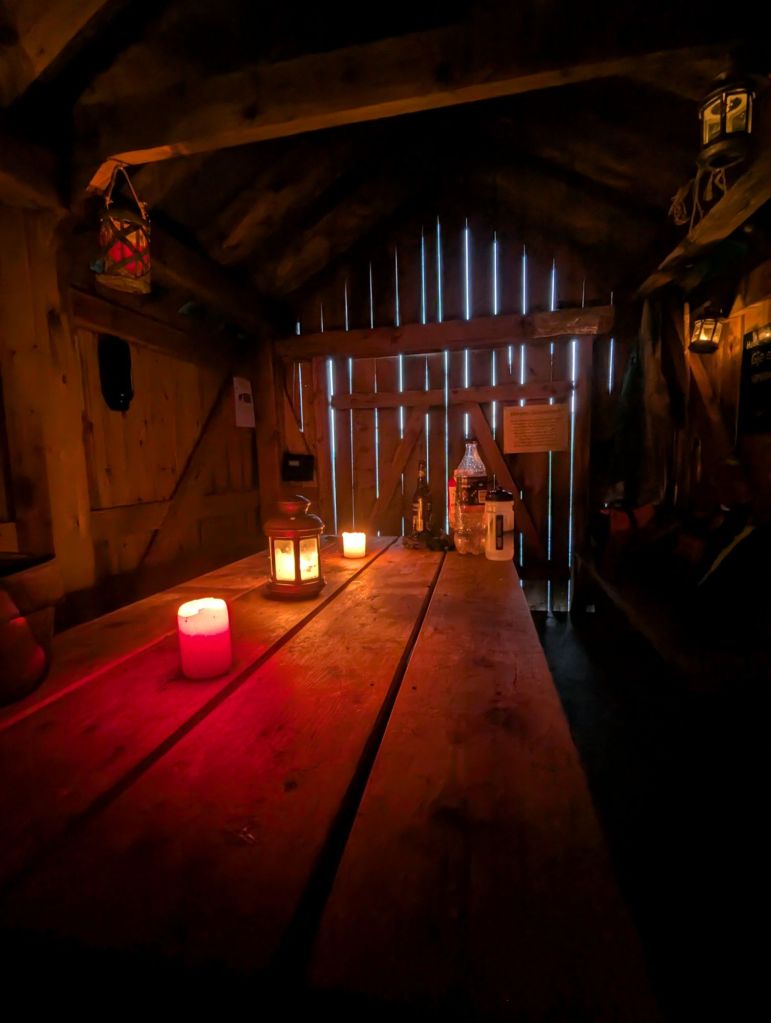 In the corner of my eye I spotted a wooden construction along an adjacent path towards the hills. Although it was enclosed on all four sides, I think what drew my eye was it appeared to have a chimney. It was clear from how the door opened and locked that it was empty, so I lifted the large wooden latch and took a peek inside. There was a portable fire pit and a large central table, with wooden bench seating around the perimeter furnished with animal skin rugs, and candle holders hung around in all shapes and sizes. The sign in Norwegian on the front confirmed it was available for anyone to use so long as you tidy up after yourself. Definitely the cosiest shelter so far, and I gave the place a much needed sweep as thanks.