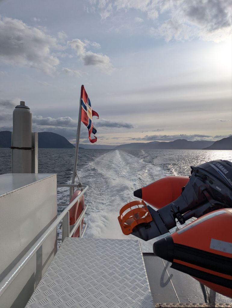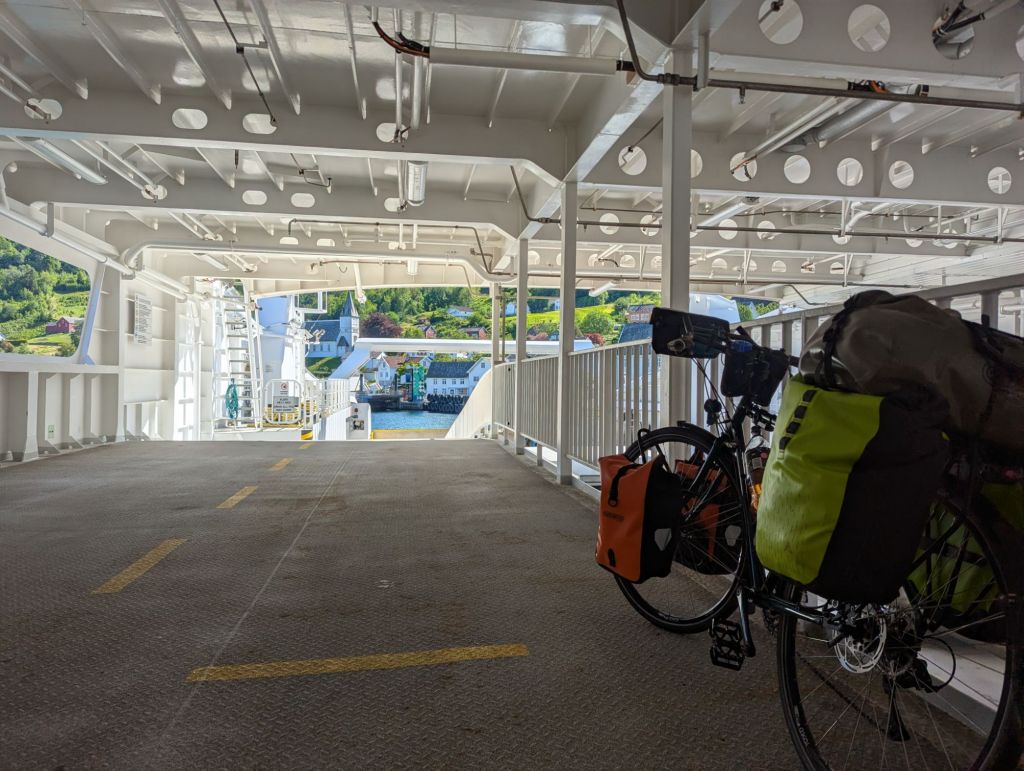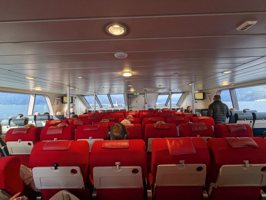 I didn’t really know what to expect from this so called ‘fast ferry’ I had booked. I knew it was operated by a private operator Norled and I nearly got on their long-distance car ferry heading back to Bergen by mistake. But there was a separate, much smaller dock for the fast ferry, which turned out to be a small catamaran for foot passengers only. I boarded along a narrow plank laid down between the jetty and the bow, where the crew member instructed me to park my bike at the back of the boat.
