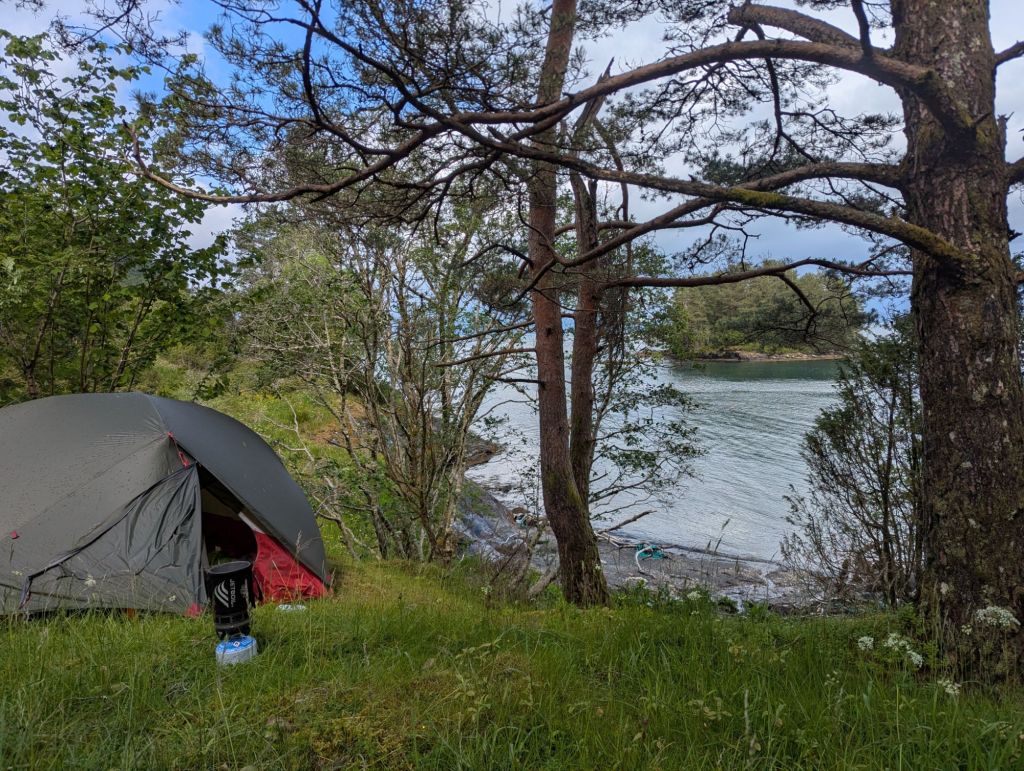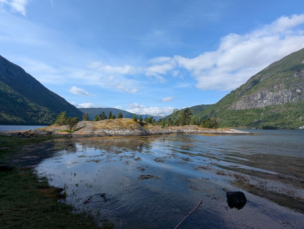 The map revealed another ‘dead-end’ road along the opposite bank of the fjord to Sogndal, so I would try my luck for a camping spot. The road turned out to be much longer in reality than in my mind and I was beginning to contemplate a quiet corner of a field on a haunted looking farm – until I spotted a group of islets just next to the shore.