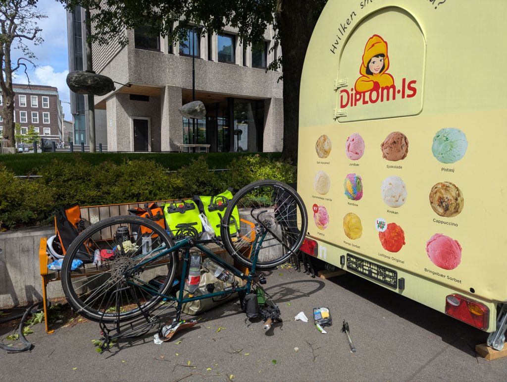 Bizarrely, on my 1 km journey to the bike lockers I managed to ride up a very pointy kerb and gave myself a flat front tyre. It was my own fault for not putting any air inside since Denmark – but if you’re going to get a flat tyre it may as well be in the middle of a city with multiple bike shops and mechanics at the ready if needed. I decided to take some time out and spend the afternoon fixing, cleaning and adjusting. By the time I left it felt almost new!
