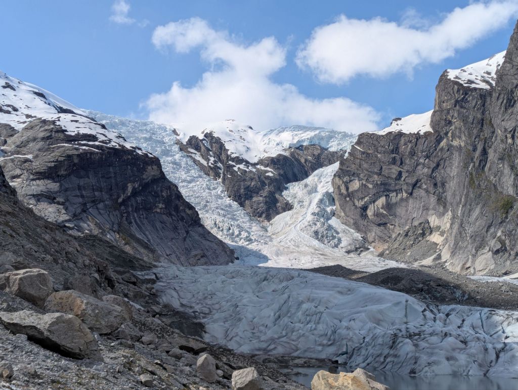 It is hard to find adequate words to describe my experience camping below the Langedalsbreen glacier. With my tent camouflaged in the middle of a boulder field, I would lay in my sleeping bag with the door open and gaze up at the mesmerising complex of ice above, spilling over the edge of the mountain and splitting to leave wrinkle lines of deep crevasses. Like gazing into the campfire it was another of nature’s TV channels, and hard to look away.